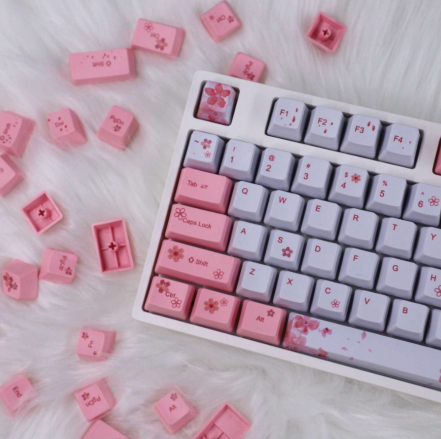 Transform your keyboard with our adorable pink and white keycap set featuring a beautiful Japanese cherry blossom tree design.